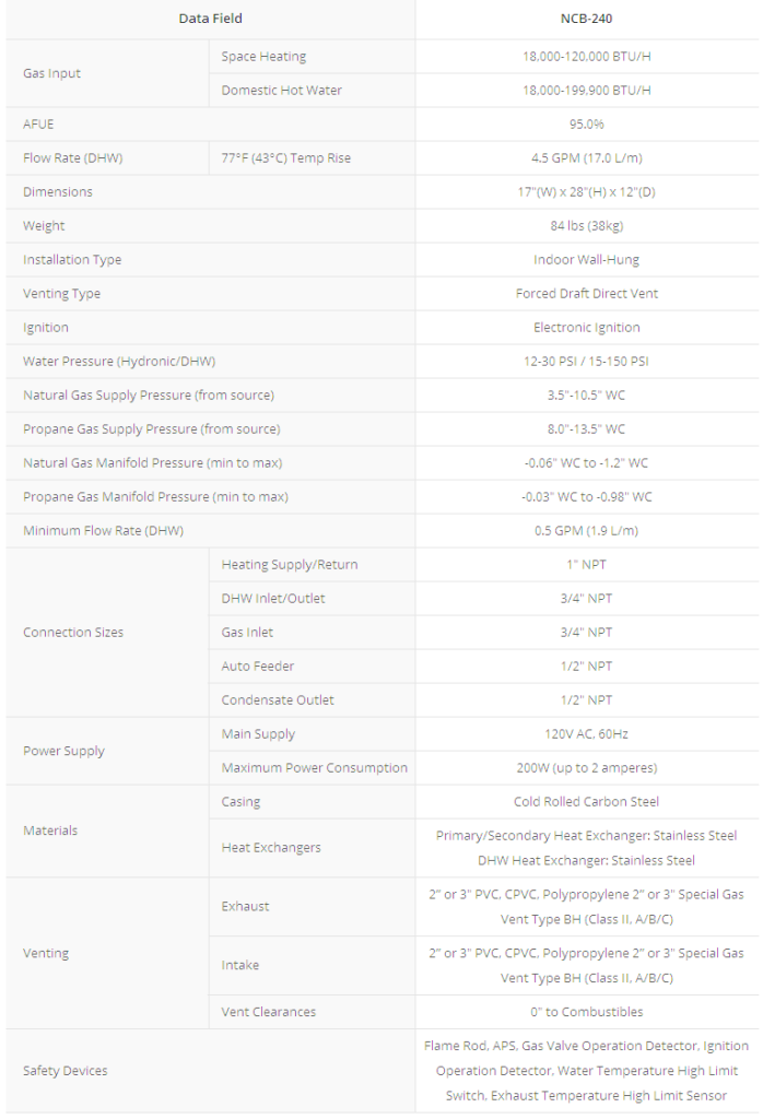 - SCH40, 2” PVC venting up to 60’ and ½” gas pipe up to 24’